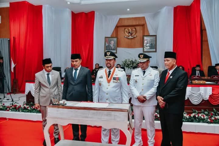 Bupati Batubara H Baharuddin Siagian, SH MSi didampingi Wakil Bupati Syafrizal, Ketua DPRD Batubara M Saffi saat menandatangani berita acara purna tugas Pj Bupati Batubara Heri Wahyudi dan penyerahan memori jabatan kepada Bupati Batubara Baharuddin Siagian Senin(3/3/2025) di Gedung Paripurna DPRD Batubara.