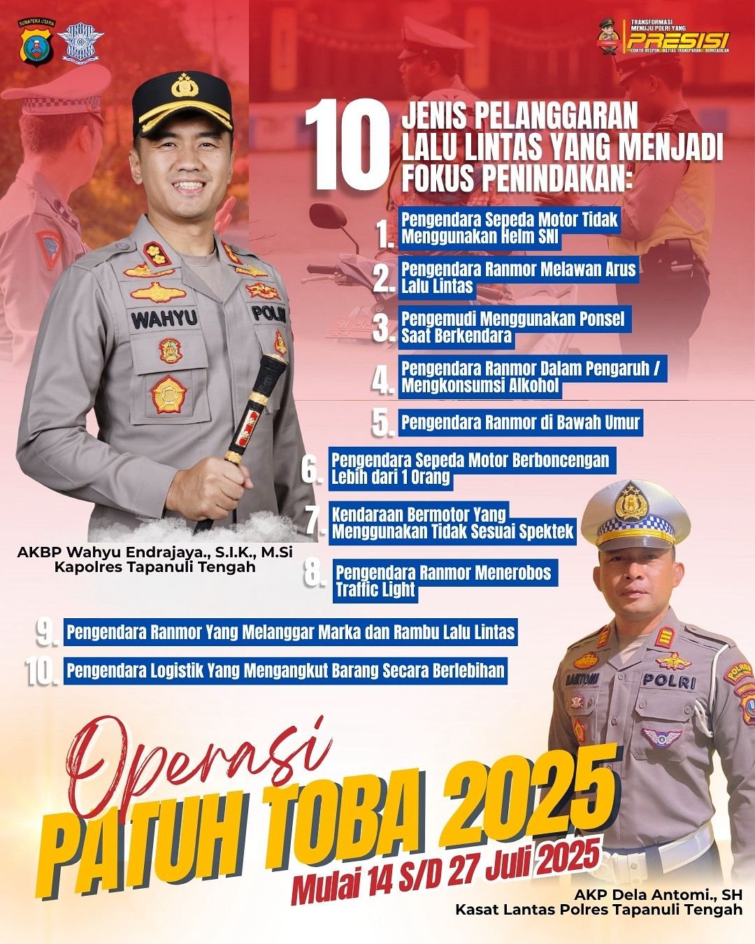 Tapanuli Tengah, Sumatera Utara – Selama dua pekan pelaksanaan Operasi Patuh Toba 2025, Satuan Lalu Lintas (Satlantas) Polres Tapanuli Tengah mencatat adanya 152 pengendara yang ditilang akibat berbagai pelanggaran lalu lintas. Operasi ini berlangsung dari tanggal 14 hingga 27 Juli 2025 dan berhasil menindak ratusan pelanggar serta memberikan teguran kepada 400 pengendara lainnya.