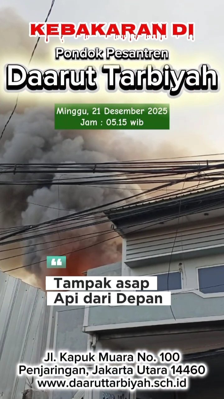 Minggu subuh, 21 Des 2025 pukul 05.00 WIB, kebakaran hebat melanda kawasan Kapuk Muara, Jakarta Utara. Api yang diduga berasal dari korsleting listrik rumah warga menghanguskan 14 rumah dan asrama putri Pondok Pesantren Daarut Tarbiyah.