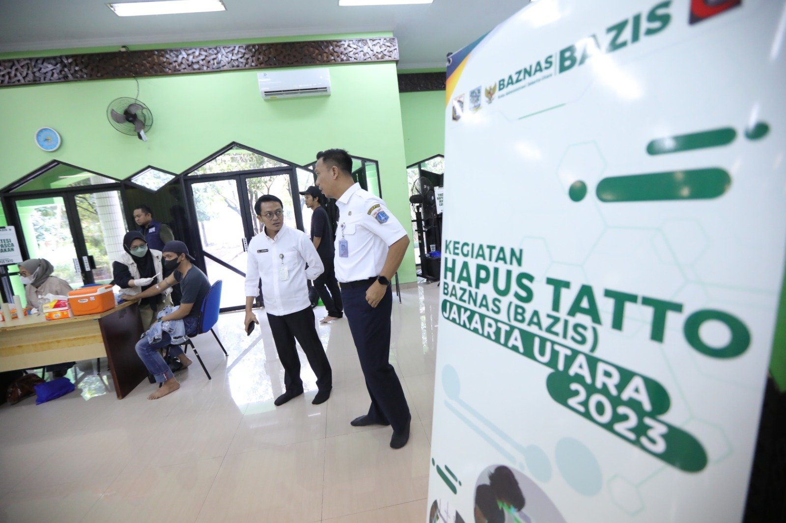 Kominfotik JU – Asisten Administrasi dan Kesejahteraan Rakyat Sekko Administrasi Jakarta Utara, Muhammad Andri meninjau kegiatan hapus tato di Lantai Dasar Masjid Babussalam Kantor Walikota Kota Administrasi Jakarta Utara, Rabu (15/11). Kegiatan yang dilaksanakan oleh Baznas (Bazis) Jakarta Utara ini diikuti sebanyak 36 orang.