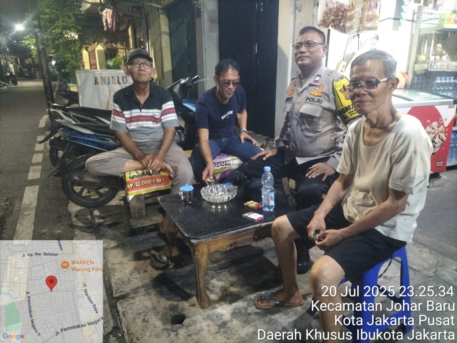 refubliknews.com, || Jakarta Pusat – Guna menjaga stabilitas kamtibmas dan memperkuat kemitraan dengan warga, Bhabinkamtibmas Kelurahan Johar Baru, Aiptu Sunarto, melaksanakan kegiatan sambang dan patroli kewilayahan di RW 11 Kelurahan Johar Baru, Kecamatan Johar Baru, Jakarta Pusat, pada Minggu malam (20/7/2025) pukul 23.40 WIB.
