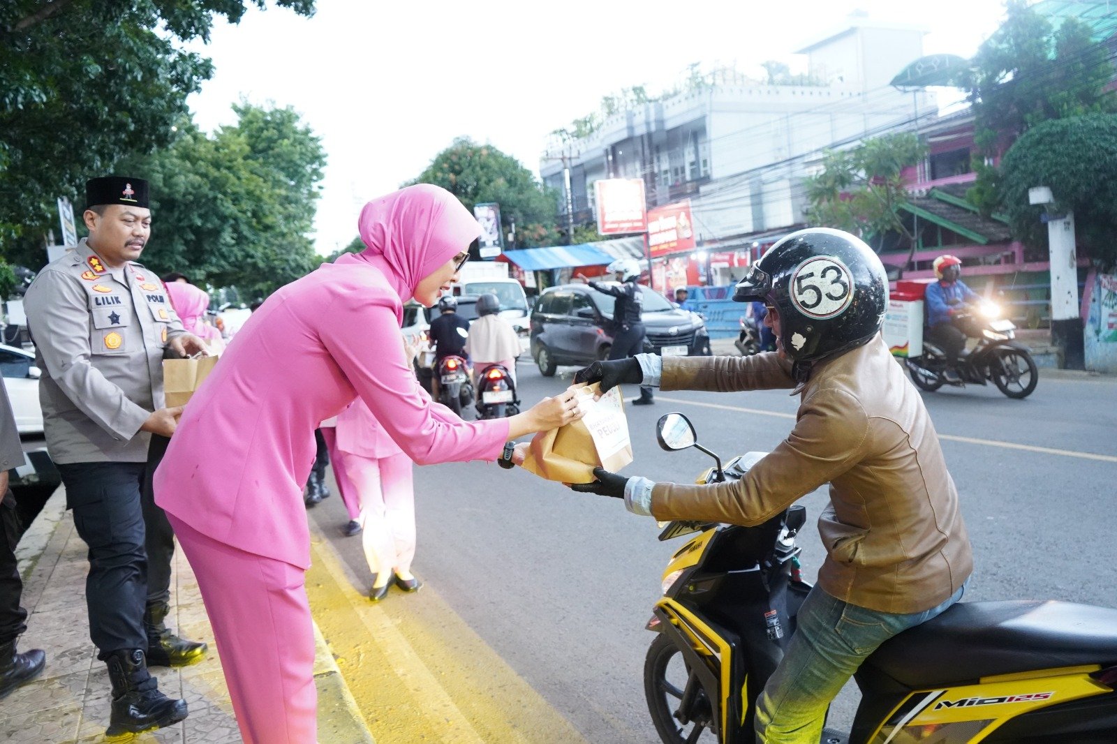 Nampak, Kapolres Purwakarta, AKBP Lilik Ardhiansyah dampingi Bhayangkari Cabang Purwakarta membagikan takjil langsung kepada pengguna yang melintas di depan Mapolres Purwakarta, Pada Jumat, 14 Maret 2025, sore.