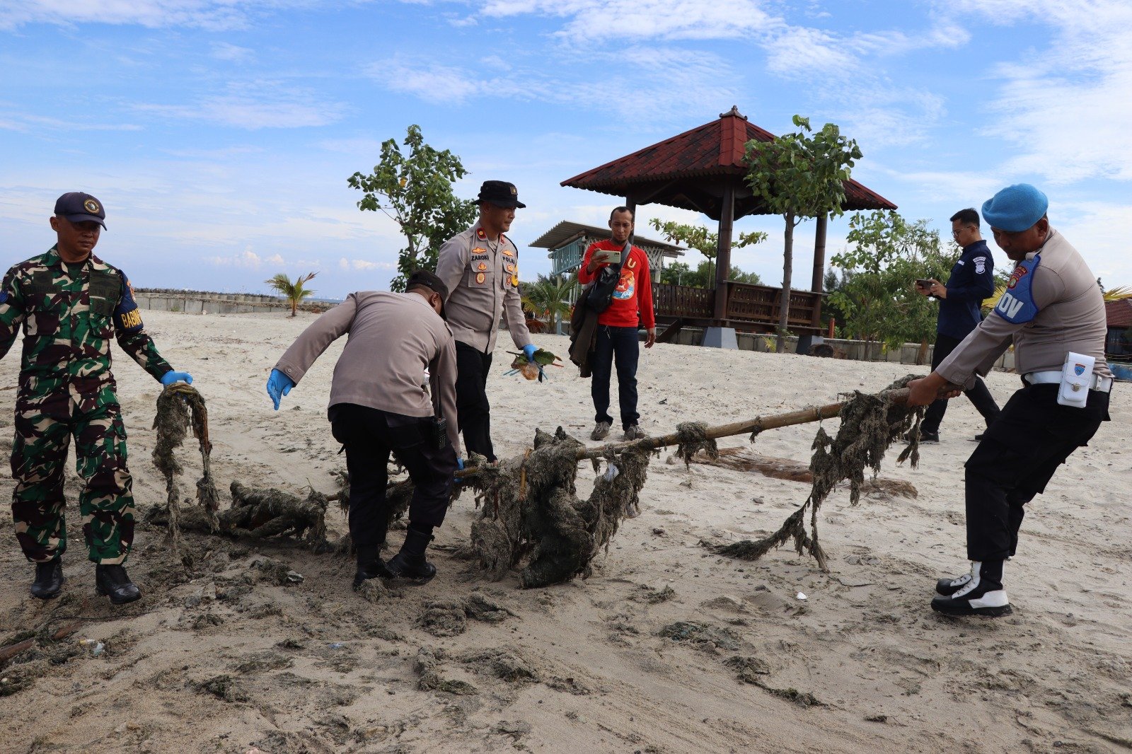 Aksi bersih pantai dilakukan dengan memungut sampah plastik, botol minuman, ranting pohon, serta limbah ringan lainnya yang tercecer di sepanjang garis pantai. Sampah yang terkumpul selanjutnya diangkut menuju Tempat Pembuangan Akhir melalui dukungan petugas kebersihan wilayah.