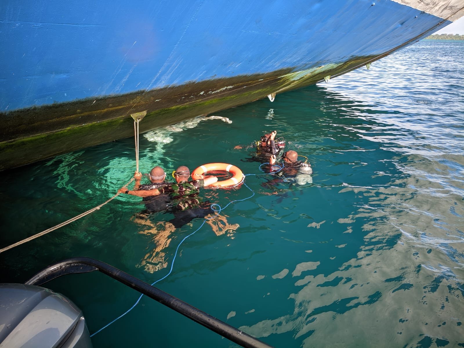 Meski harus menghadapi arus bawah laut yang cukup kuat serta pandangan yang terbatas, tim selam berhasil melepaskan tali yang melilit bagian propeler kapal.