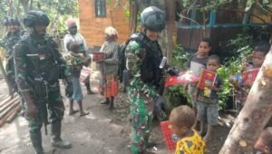 Kodam Jaya – Papua. Satgas Yonif Mekanis 203/AK Pos Pirime melaksanakan aksi door to door untuk membagikan baju untuk masyarakat dan alat tulis untuk anak-anak sekolah di Kampung Aniwo Distrik Pirime Kab. Lanny Jaya, Papua.