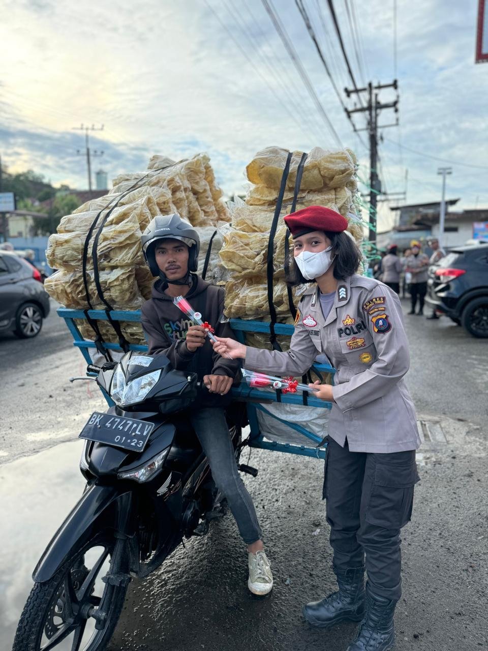 Para Polwan terlihat aktif mengatur arus lalu lintas di lokasi yang sering padat, terutama saat jam sekolah. Selain mengatur lalu lintas, Polwan juga dengan sigap membantu anak-anak sekolah menyeberang jalan dengan aman. Sebagai wujud apresiasi kepada masyarakat, para Polwan membagikan bunga kepada para pengguna jalan sebagai simbol peringatan Hari Jadi Polwan RI ke-76.