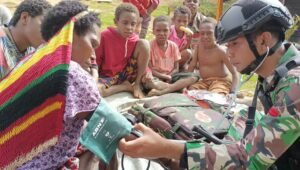 Seiring dengan perubahan cuaca yang terjadi di Pegunungan Tengah Personel Pos Malagayneri Satgas Yonif Mekanis 203/AK menjemput bola untuk mengadakan kegiatan pelayanan kesehatan gratis bagi masyarakat sekitar pos salah satunya di Desa Ganume Distrik Malagayneri, Kabupaten Lanny Jaya, Papua, Kamis (9/02/2023)