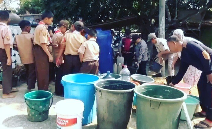 Untuk membantu warga desa, jajaran Polres Purwakarta, Polda Jawa Barat turun tangan menyerahkan bantuan air bersih kepada warga terdampak, warga yang terdampak air bersih rela mengantri untuk mendapatkan bantuan dari pihak polisi tersebut.