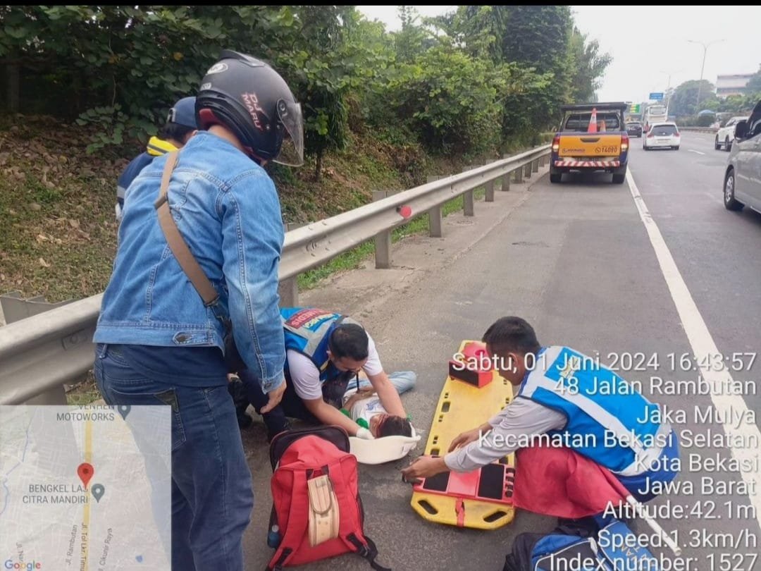 Selanjutnya korban dibawa oleh petugas Jasa Marga menuju rumah sakit Pondok Kopi untuk mendapatkan pertolongan.