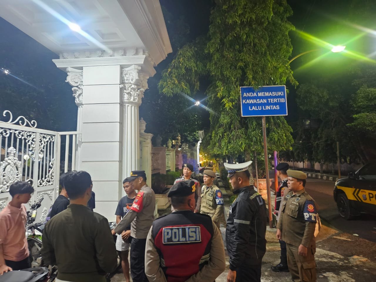 Patroli menyampaikan pesan tertib lalu lintas dan menjaga Kamtibmas. Masyarakat juga diingatkan untuk melapor jika menemukan gangguan keamanan. - Gedung Nasional Kota Sibolga