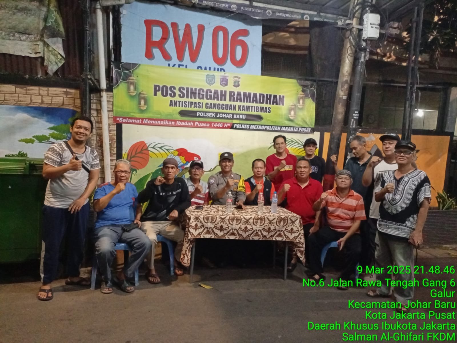 refubliknews.com, – Jakarta Pusat – Pada Minggu malam, tanggal 09 Maret 2025, pukul 22.00 WIB, Dalam rangka menjaga kondusivitas keamanan dan ketertiban selama bulan suci Ramadhan 1446 H, Bhabinkamtibmas Galur Aiptu Baktiar Emri bersama dengan Suroso Ketua RW 06 selalu tokoh masyarakat setempat dan pengurus RT menggelar pengawasan di Pos Singgah Ramadhan, Jalan Rawa Tengah RT 08 RW 06 Kelurahan Galur, Kecamatan Johar Baru Jakarta Pusat. Senin (10/03/2025).