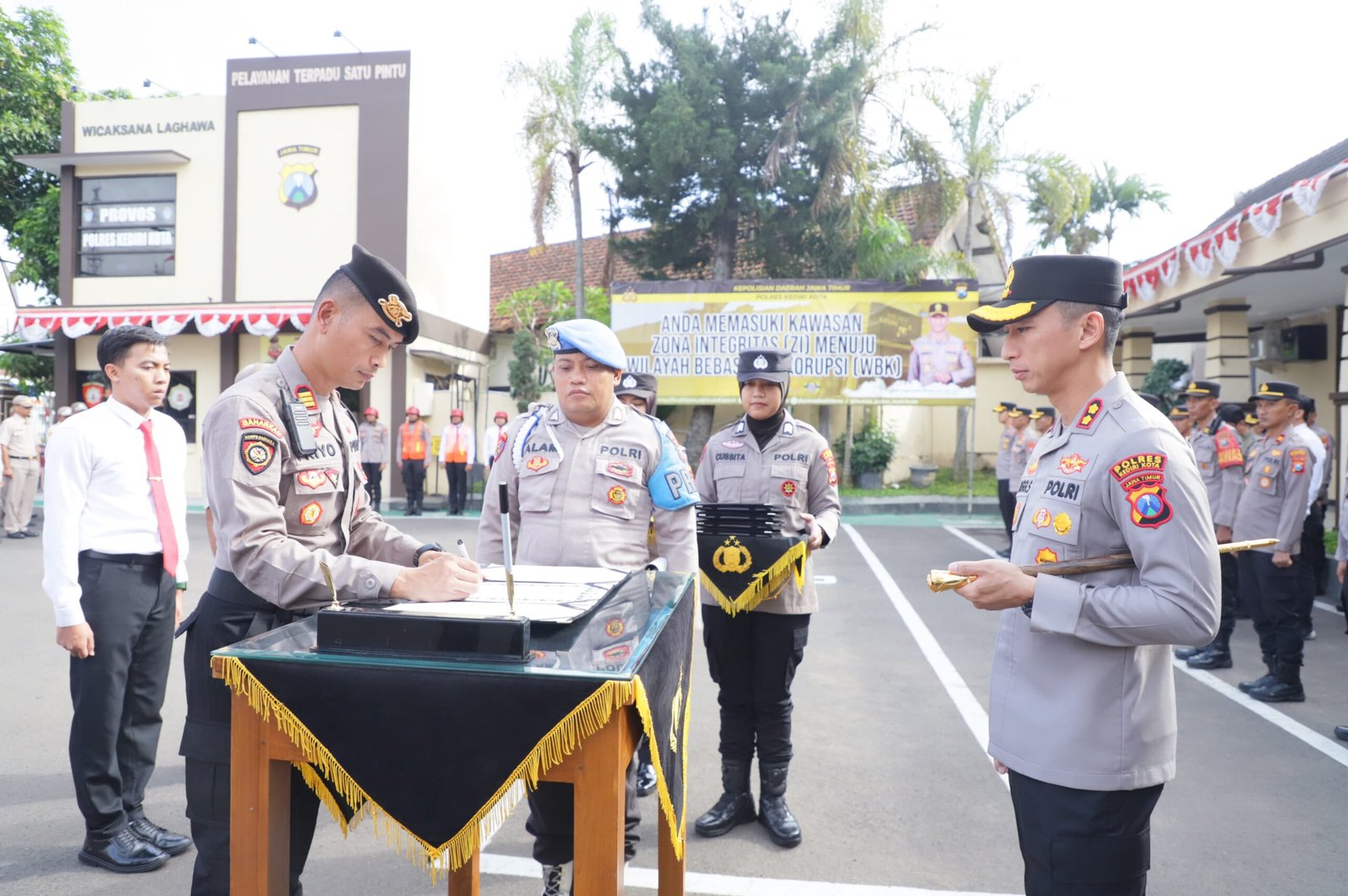 Apel dipimpin langsung oleh Kapolres Kediri Kota AKBP Anggi Saputra Ibrahim, S.H., S.I.K., M.H. Dalam kesempatan tersebut, perwakilan anggota secara simbolis menandatangani Pakta Integritas yang berisi komitmen untuk menjaga nilai-nilai Tribrata dan Catur Prasetya, menjalankan tugas dengan jujur dan penuh rasa tanggung jawab, serta menolak segala bentuk pelanggaran termasuk penyalahgunaan narkoba.
