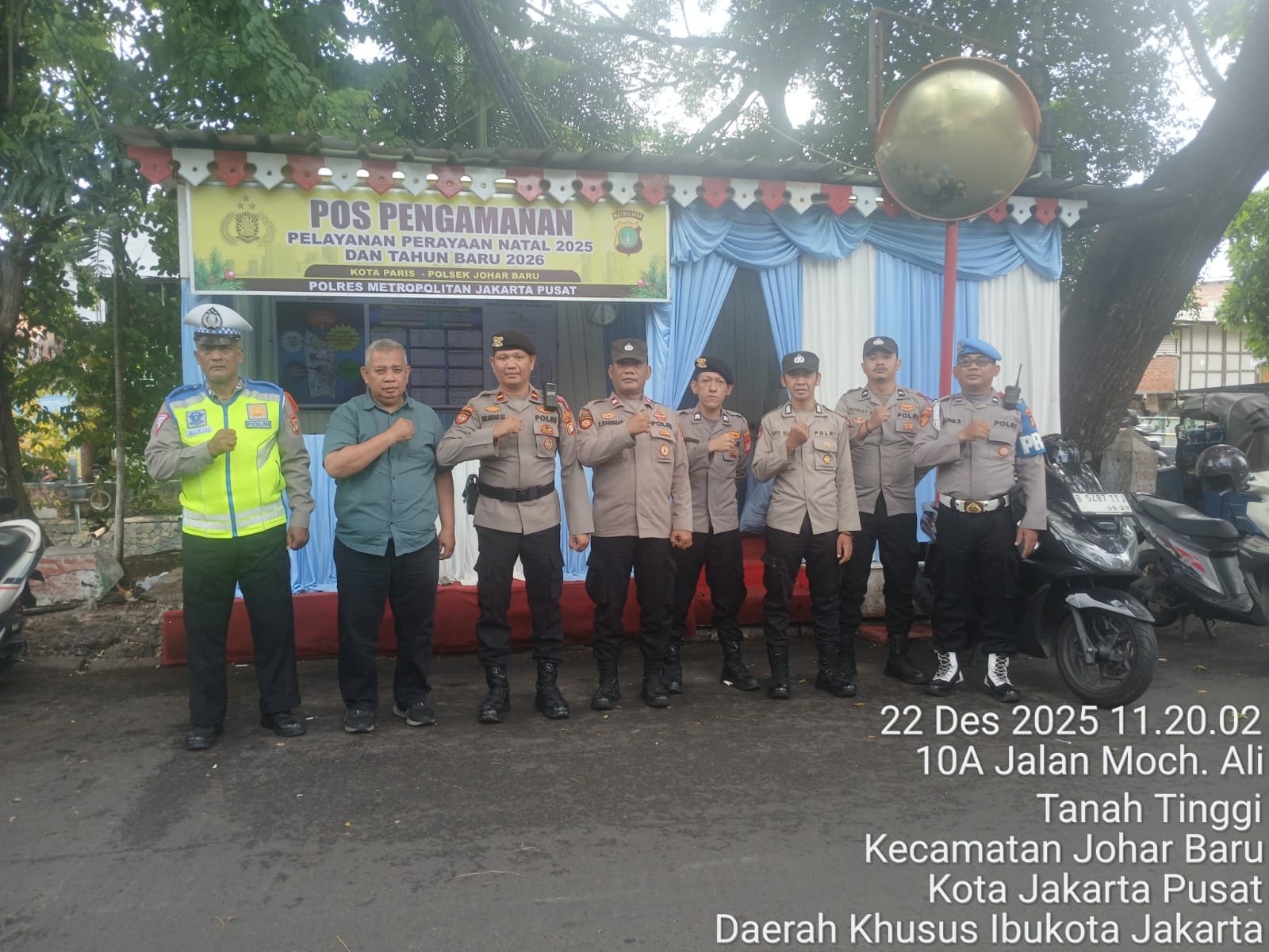 Jakarta Pusat — Dalam rangka memastikan kesiapsiagaan personel serta kelancaran pengamanan dan pelayanan masyarakat pada perayaan Natal 2025 dan Tahun Baru 2026, jajaran pimpinan Polres Metro Jakarta Pusat dan Polsek Johar Baru melaksanakan kunjungan asistensi ke Pos Pengamanan (Pospam) Kota Paris, Senin (22/12/2025).