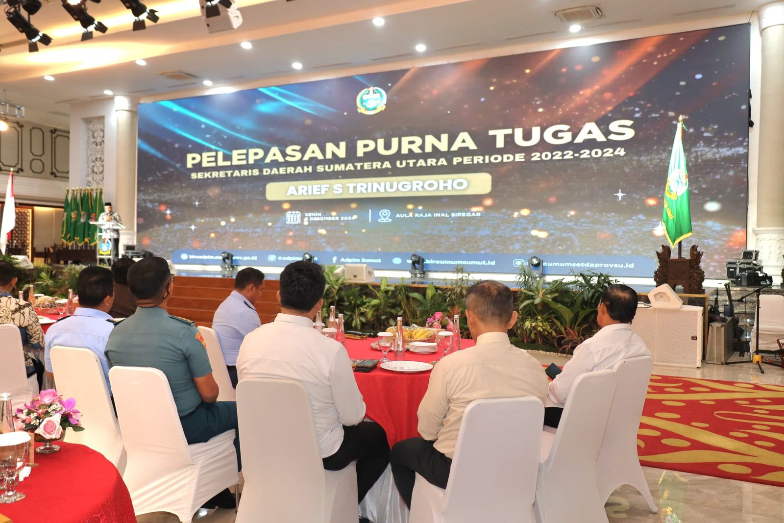 Pj. Gubernur Sumatera Utara Dr. Drs. Agus Fatoni menyampaikan selamat memasuki purna tugas kepada Arief S. Trinugroho sebagai Sekda Provinsi Sumut periode 2022-2024. Terima kasih atas pengabdian selama ini di Provinsi Sumatera Utara. Bapak selalu melaksanakan tugas pengabdian dengan penuh dedikasi dan tanggung jawab. Ini suatu sikap yang harus diteladani oleh seluruh aparatur pemerintahan khususnya di lingkungan Provinsi Sumatera Utara.