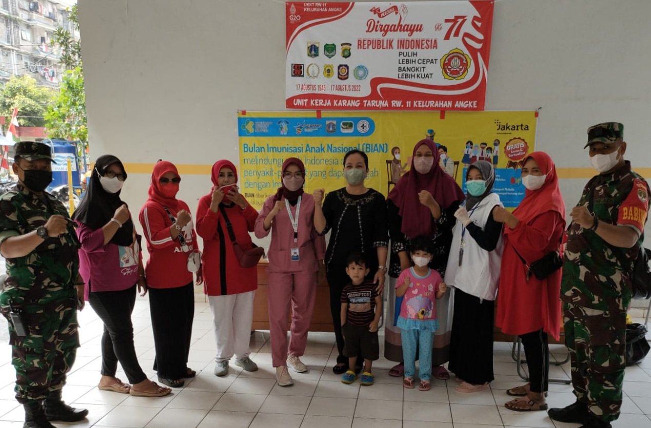 Kodam Jaya Jakarta -Babinsa Koramil 02/TB Kodim 0503/JB Serma Mi’an dan Serda Sarip St monitoring kegiatan Gebyar bulan imunisasi anak nasional ( BIAN) yang dilaksanakan oleh Tim medis puskesmas Kel.Angke dalam rangka memberikan tambahan vitamin dan imunisasi rubela pada anak balita