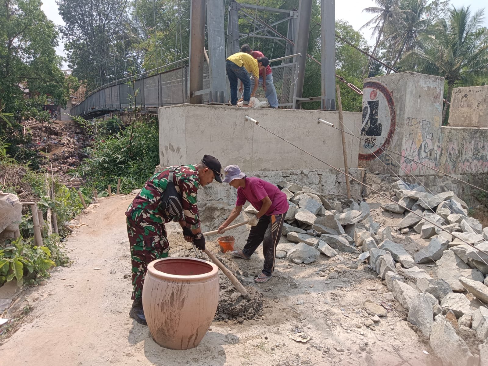 Kodim 0621/Suryakencana, Babinsa Koramil 0621-23/PP Desa Dago Serka Dede melaksanakan Monitoring pengawasan pembangunan jembatan RAWAYAN di kp. Dago parung Rt 03 Rw 02 Desa Dago Kecamatan Parungpanjang.Jumat 15/10/2023