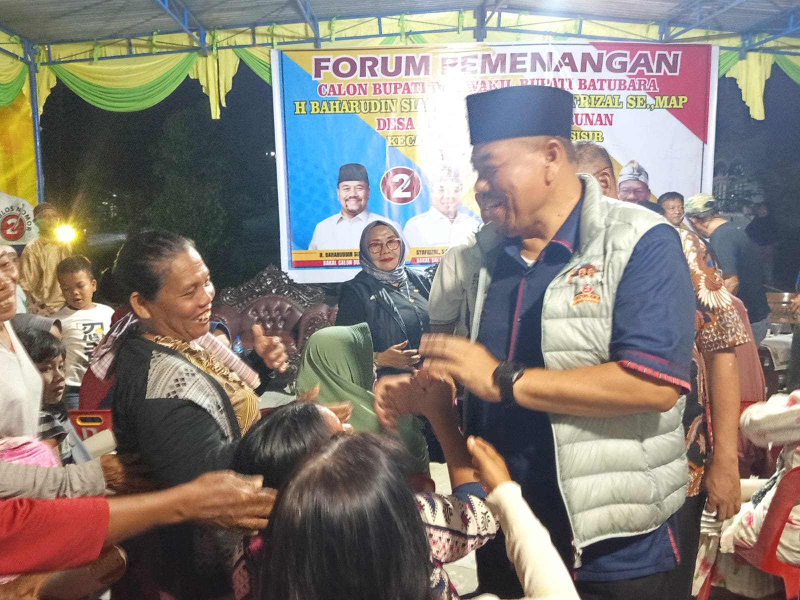 Antusias 500-an warga Masyarakat Panurunan, Desa Lubuk Cuik, Desa Bulan Bulan Kec Limapuluh Pesisir, Batubara menyambut kedatangan Paslon Bupati-Wakil Bupati Batubara No Urut 02 H Baharuddin Siagaian, SH, MSi dan Cawabup Syafrizal, Jumat(22/11) malam di halaman kediaman Rosbon Sitinjak, Ketua DPC HKTI Batubara.
