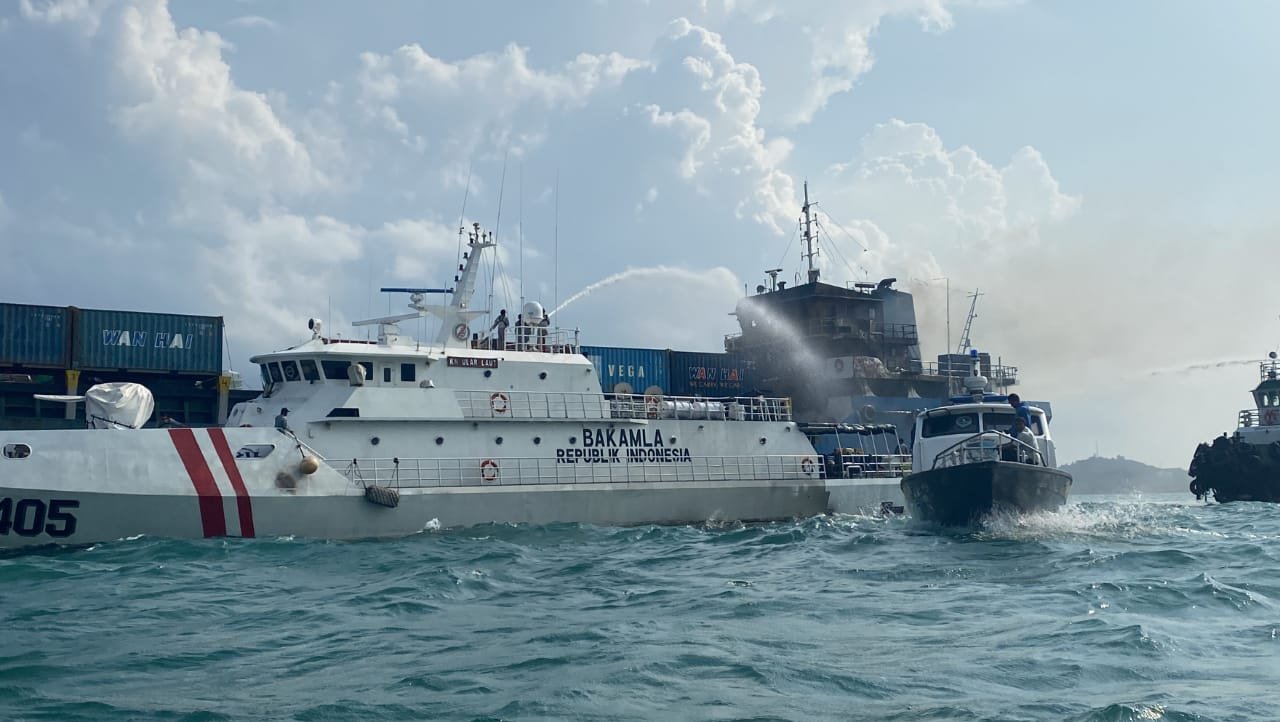 Pemadaman dilakukan oleh KN Ular Laut-405 milik Bakamla RI, KRI Bubara-868 milik TNI AL, dan TB Megamas Sky. Pada patroli keselamatan ini, pihak yang terlibat meliputi Bakamla RI, TNI AL, Polri, dan Basarnas. (Humas Bakamla RI)
