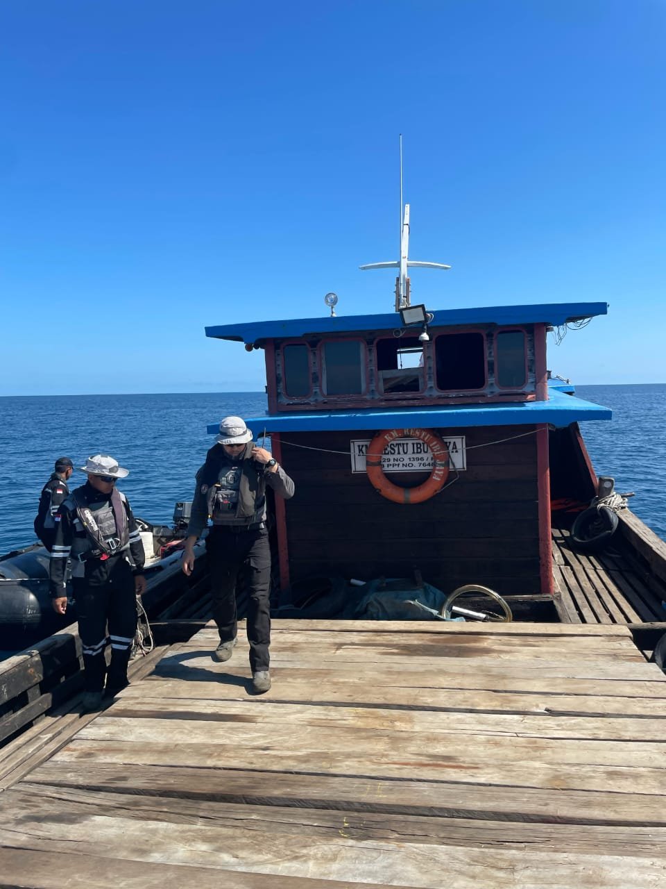 Selain pelanggaran administratif, kapal juga mengalami kerusakan mesin. Guna mencegah risiko lebih lanjut, KN. Tanjung Datu-301 melakukan proses towing terhadap KM Doa Restu Ibu Jaya menuju Batam untuk proses penyelidikan dan penanganan hukum lebih lanjut. (Humas Bakamla RI)