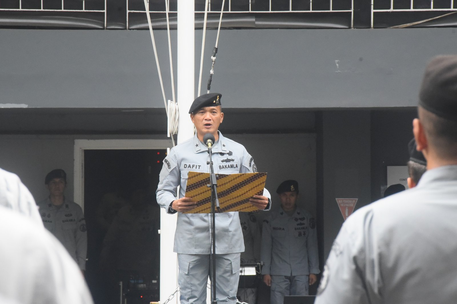 Mengakhiri amanat, Inspektur Upacara mengajak seluruh personel Bakamla RI untuk bergotong royong merawat anugerah Pancasila dan memompa semangat untuk terus mengamalkan Pancasila demi Indonesia yang maju, adil, makmur, dan berwibawa di kancah dunia. (Humas Bakamla RI)