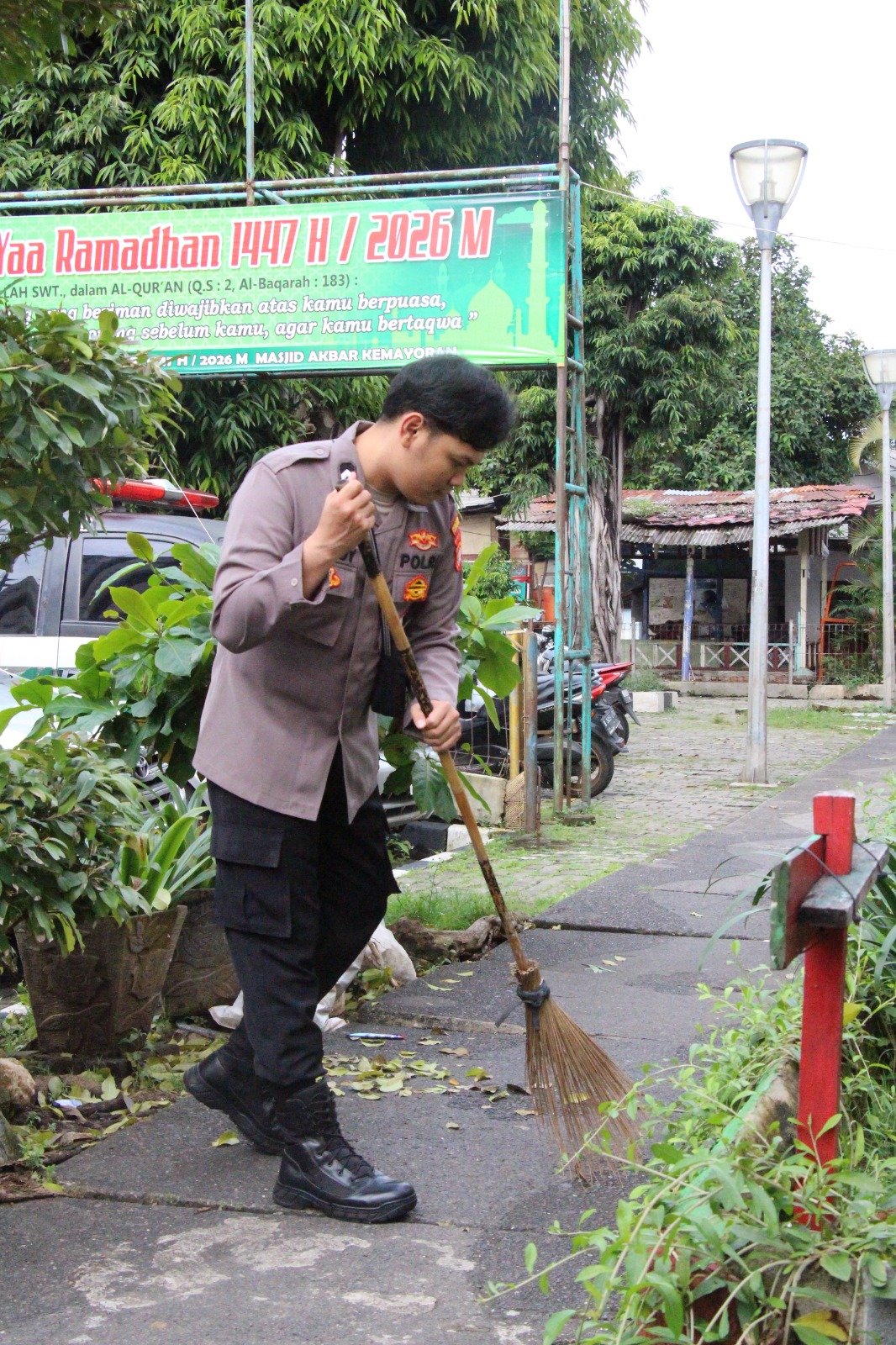 Kegiatan tersebut dilaksanakan di Masjid Akbar, dengan melibatkan personel kepolisian, satuan lalu lintas, serta pengurus Dewan Kemakmuran Masjid (DKM) dan warga sekitar. Aksi ini dilakukan sebagai upaya menjaga kebersihan dan kenyamanan rumah ibadah agar dapat digunakan secara optimal oleh masyarakat.