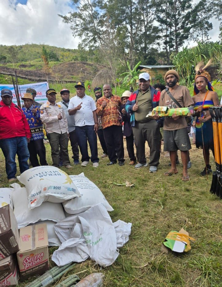 refubliknews.com,- Jayawijaya – Bupati Kabupaten Jayawijaya, Atenius Murip, S.H., M.H., bersama sejumlah pejabat daerah menyalurkan bantuan alat kerja pertanian dan kebutuhan pokok kepada warga di Distrik Yalengga dan Distrik Bolakme, Papua Pegunungan, pada Minggu (29/6/2024).
