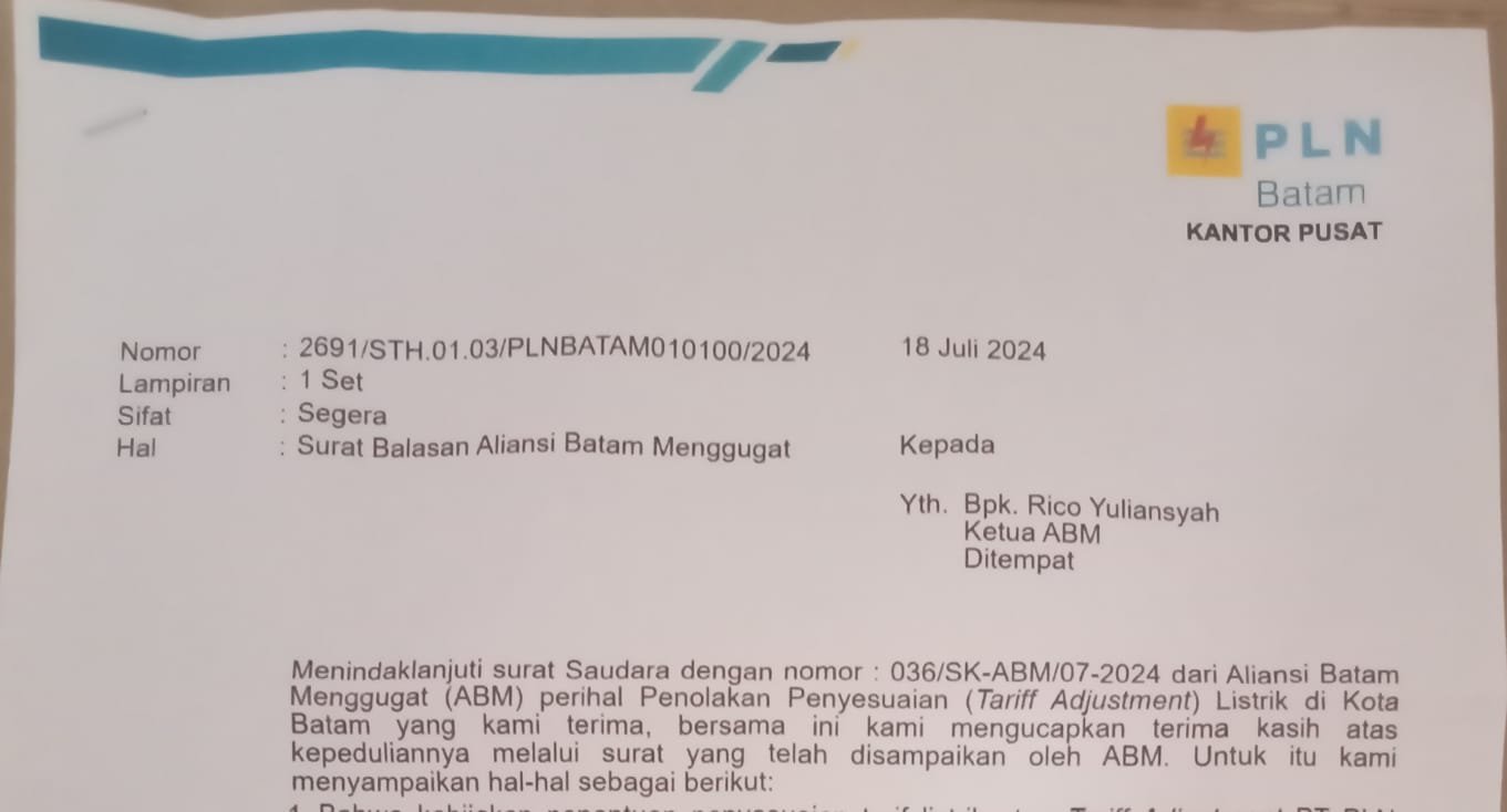 Dalam surat yang diterima oleh ABM pada hari Jum’at (19-07-24) tersebut, terdapat 4 poin yang dijelaskan oleh Sekper PT. PLN Batam, Zulhamdi terkait penyesuaian (Tariff Adjustment) Listrik di Kota Batam.