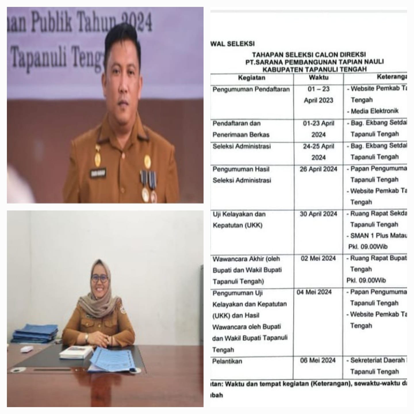 Berdasarkan keputusan Pj.Bupati Tapanuli Tengah, 463/EKBANG/2024, tentang Pembentukan Panitia Seleksi Komisaris dan Direksi PT Sarana Pembangunan Tapian Nauli Kabupaten Tapanuli Tengah dan Keputusan Bupati Kabupaten Tapanuli Tengah, nomor : 539/EKBANG/2024, tentang Pembentukan Tim Seleksi Komisaris dan Direksi PT Sarana Pembangunan Tapian Nauli Kabupaten Tapanuli Tengah, mengundang Bapak/Ibu/Saudara-saudiri, untuk mengikuti seleksi terbuka calon Direksi PT Sarana Pembangunan Tapian Nauli Kabupaten Tapanuli Tengah.