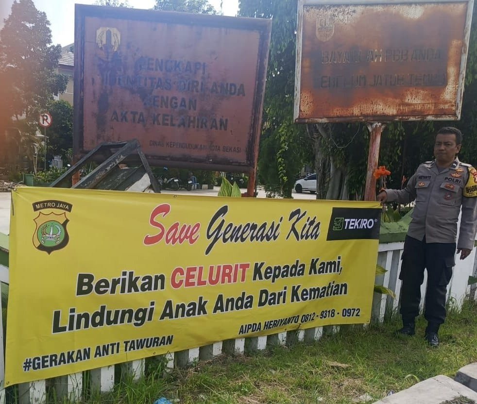 refubliknews.com,- Dalam upaya mencegah aksi tawuran remaja yang semakin marak, Bhabinkamtibmas Kelurahan Bekasi Jaya, Aipda Heryanto, melakukan pemasangan spanduk bertuliskan “SAVE GENERASI KITA, BERIKAN CLURIT KEPADA KAMI, LINDUNGI ANAK ANDA DARI KEMATIAN” di Jalan Mekarsari RT 08 RW 07, Kecamatan Bekasi Timur, Kamis (13/2).