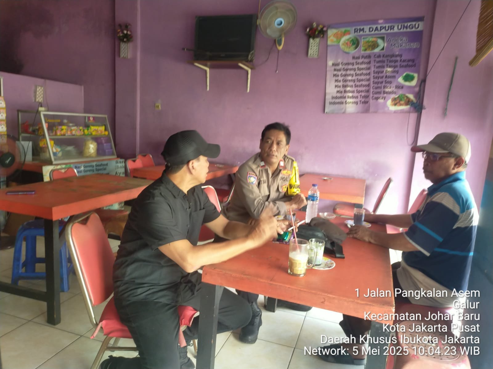 refubliknews.com, || Jakarta Pusat – Giat sambang oleh Bhabinkamtibmas Kelurahan Galur di RW 07, Kecamatan Johar Baru, Jakarta Pusat, berlangsung lancar pada Senin pagi, 5 Mei 2025. Aiptu Baktiar, Bhabinkamtibmas Kelurahan Galur, bertemu dengan tokoh masyarakat dan ormas setempat dalam rangka deteksi dini potensi gangguan kamtibmas.