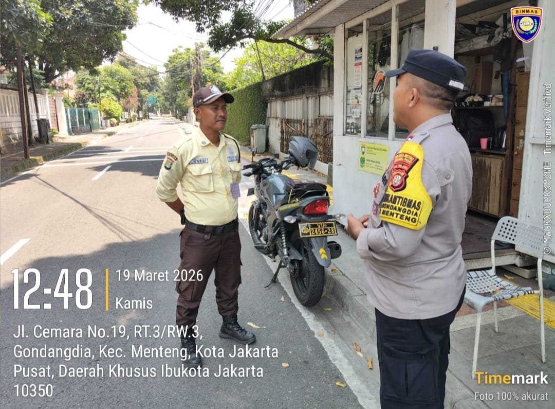 Jakarta Pusat – Guna menjaga situasi keamanan dan ketertiban masyarakat (kamtibmas) tetap aman dan kondusif, Bhabinkamtibmas Kelurahan Gondangdia, Aiptu Kamidi, melaksanakan kegiatan sambang wilayah di lingkungan Jalan Cemara RT 03 RW 03, Gondangdia, Menteng, Jakarta Pusat. Kegiatan ini menjadi bagian dari upaya preventif kepolisian dalam mengantisipasi potensi pencurian serta berbagai tindak kejahatan lainnya di lingkungan permukiman warga. Kamis (19/3/2026)