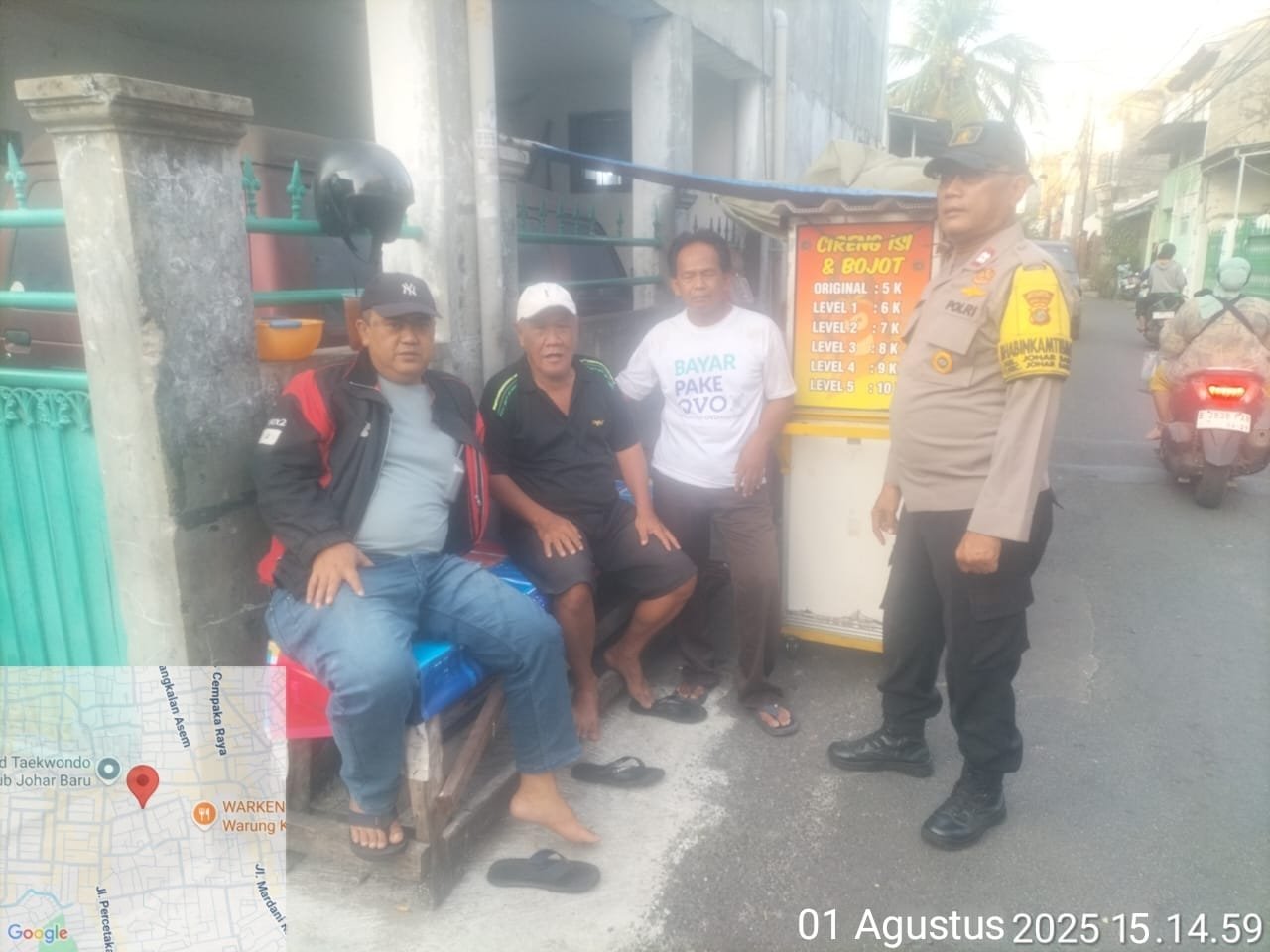 Kegiatan berlangsung di Jl. Johar Baru Utara I, dan dalam kesempatan tersebut Aiptu Sunarto bertemu dengan Bapak Jaenal, Ketua RT 12/RW 03, dan Bapak Iksak, salah satu tokoh warga RW 03. Melalui pendekatan humanis dan dialogis, Aiptu Sunarto menyampaikan pesan-pesan kamtibmas sebagai bagian dari upaya cooling system guna menciptakan lingkungan yang aman dan kondusif.