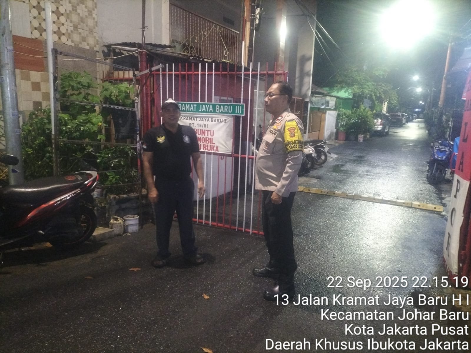 refubliknews.com, || Jakarta Pusat – Upaya menjaga situasi kamtibmas terus digencarkan jajaran Polsek Johar Baru. Senin malam (22/9/2025) pukul 22.30 WIB, Bhabinkamtibmas Kelurahan Johar Baru, Aiptu Sunarto, melaksanakan patroli dialogis dan sambang ke Poskamling RT 15/RW 01, Jl. Kramat Jaya Baru 2 dan 3, Kelurahan Johar Baru, Jakarta Pusat.