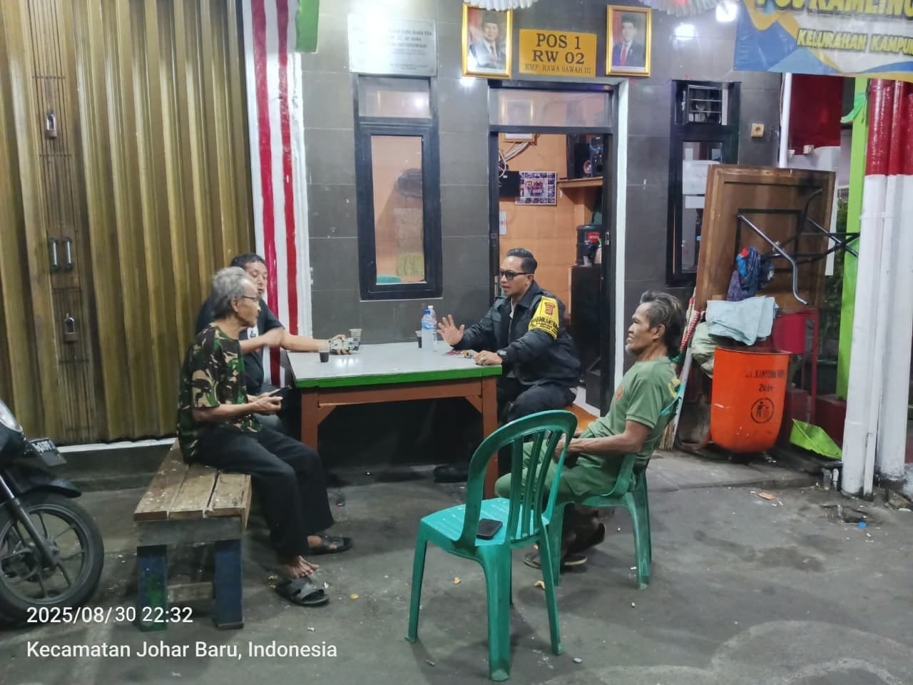 refubliknews.com, || Jakarta Pusat – Dalam rangka meningkatkan keamanan dan ketertiban masyarakat, Bhabinkamtibmas Kelurahan Kampung Rawa, Aipda Ikhwan, melaksanakan patroli wilayah sekaligus sambang ke Pos Satkamling RW 02, Jl. Rawa Sawah 3, Kelurahan Kampung Rawa, Kecamatan Johar Baru, Jakarta Pusat, pada Sabtu malam (30/8/2025) pukul 22.30 WIB.