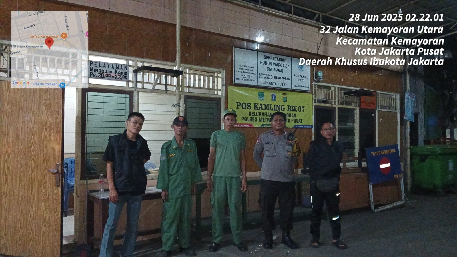 refubliknews.com, || Jakarta Pusat – Dalam upaya menjaga keamanan dan ketertiban masyarakat (kamtibmas), Bhabinkamtibmas Kelurahan Kemayoran Aiptu Dwi Yulianto bersama anggota Pokdarkamtibmas melaksanakan patroli dan sambang ke Pos Kamling RW 07 Kelurahan Kemayoran, Jakarta Pusat, Sabtu (28/6/2025) dini hari.