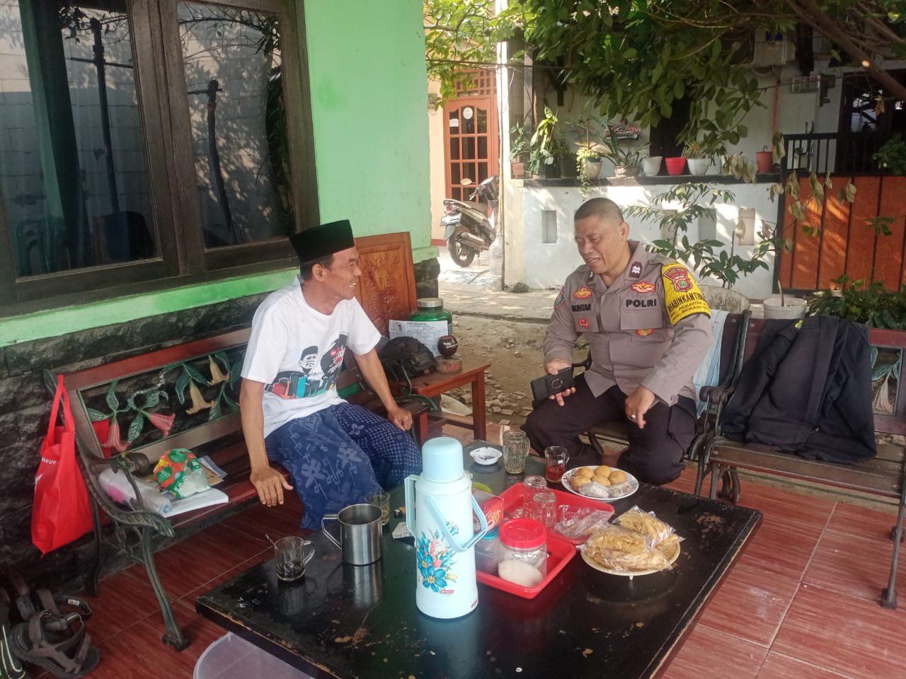 AIPTU Muhtar Yahya Gunawan melakukan kunjungan ke tokoh masyarakat setempat, H. Nawawi, yang juga merupakan Ketua RW 04 Pekayon Jaya kecamatan Bekasi Selatan.