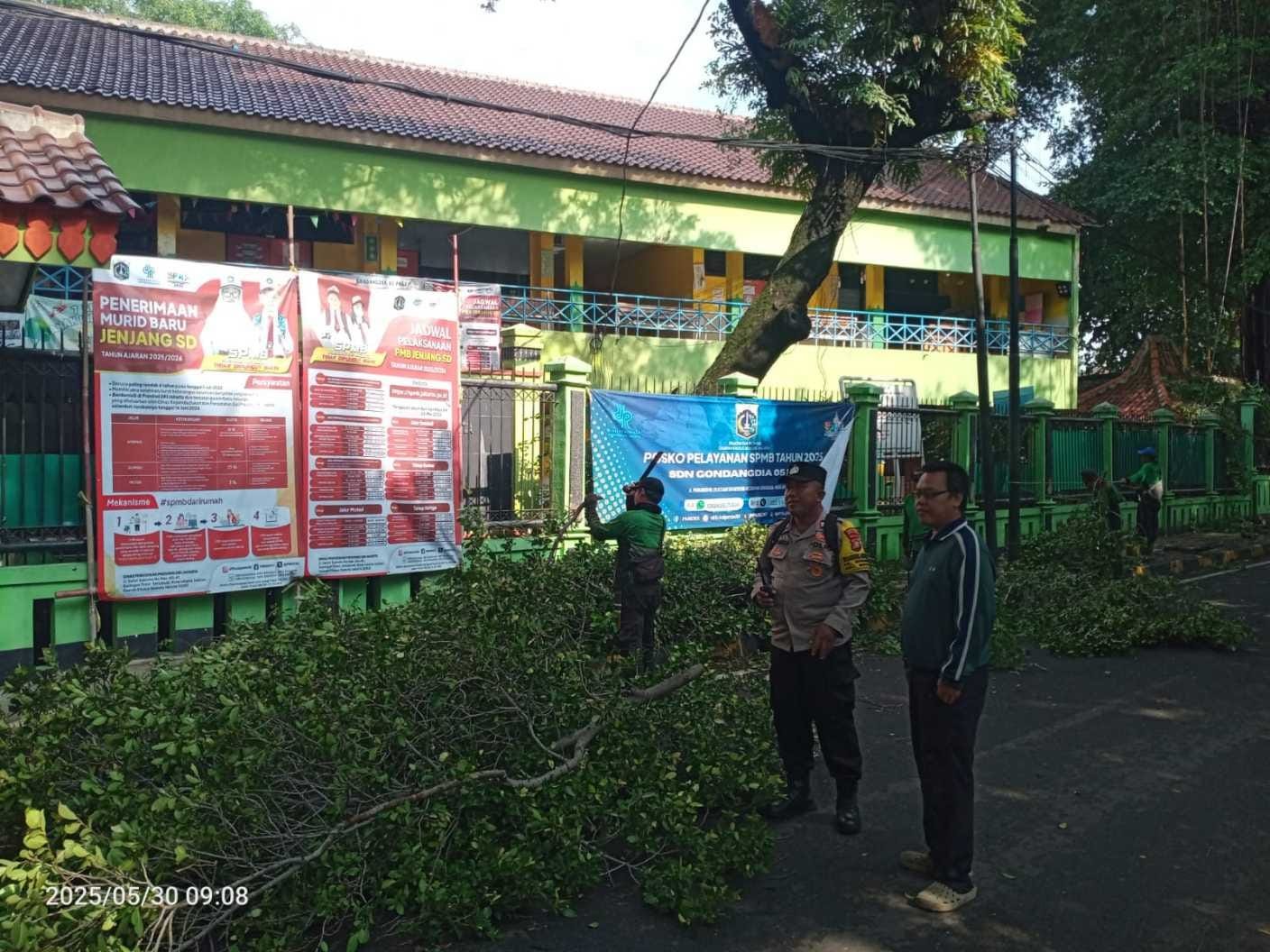 refubliknews.com, || Jakarta Pusat – Dalam upaya menjaga keselamatan warga serta mencegah potensi bahaya di musim penghujan, Bhabinkamtibmas Kelurahan Gondangdia, Aiptu Kamidi, melaksanakan kegiatan pemantauan giat penopingan (pemangkasan) pohon beringin yang dilakukan oleh petugas dari Dinas Pertamanan dan Hutan Kota Provinsi DKI Jakarta. Kegiatan ini berlangsung di area Sekolah Dasar Negeri (SDN) Gondangdia 05, yang berlokasi di Jalan Probolinggo, RT 01 RW 01, Kelurahan Gondangdia, Kecamatan Menteng, Jakarta Pusat. Jumat (30/5/2025)