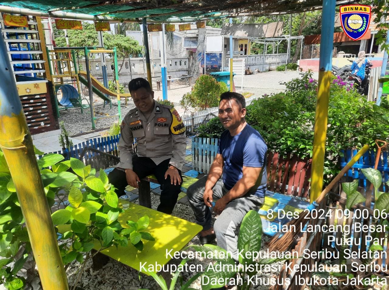 refubliknews.com,- Jakarta – Bhabinkamtibmas Pulau Lancang, Polres Kepulauan Seribu, Briptu Tulus Hidayat, melaksanakan kegiatan sambang kepada warga di wilayahnya, Senin (09/12/2024). Kegiatan ini bertujuan untuk memastikan situasi tetap kondusif pasca berlangsungnya Pilkada DKI Jakarta Tahun 2024.