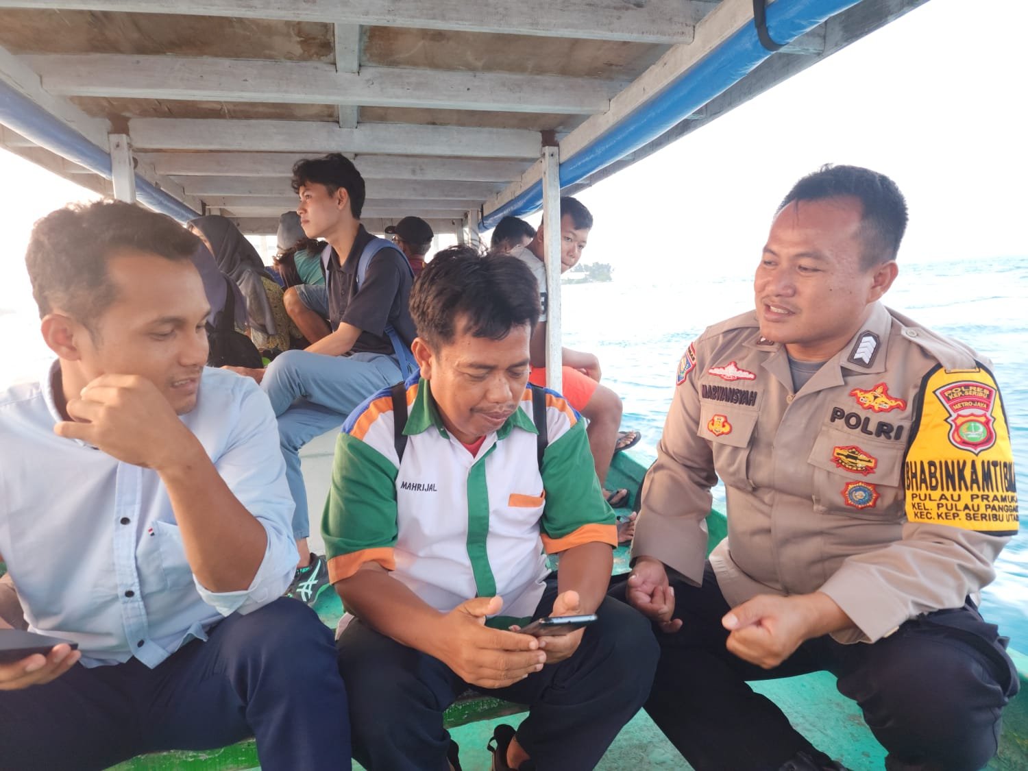Dalam pertemuan yang hangat dan penuh keakraban, Bripka Marwansyah berdiskusi dengan kedua warga tersebut tentang kondisi keamanan di Pulau Pramuka dan cara-cara untuk menjaga ketertiban di lingkungan sekitar. Diskusi berlangsung santai di atas kapal kayu, diiringi dengan deburan ombak dan semilir angin laut yang menambah kehangatan suasana.