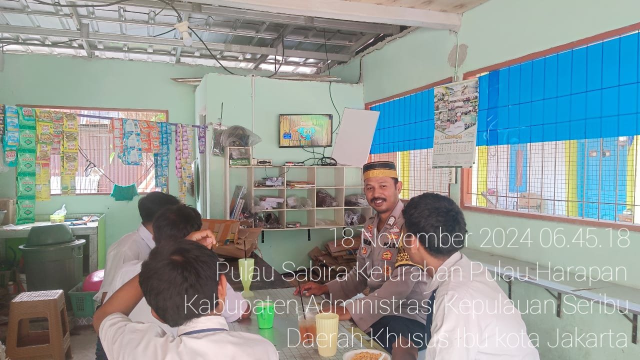 refubliknews.com, – Jakarta – Bhabinkamtibmas Pulau Sabira, Polres Kepulauan Seribu, Bripka Amirulloh Maliki, S.H., melaksanakan kegiatan sambang ke sekolah-sekolah di Pulau Sabira pada Senin (18/11/2024). Kegiatan ini dilakukan untuk memberikan penyuluhan dan imbauan kepada para pelajar agar menjauhi tawuran serta kenakalan remaja yang dapat merusak masa depan.