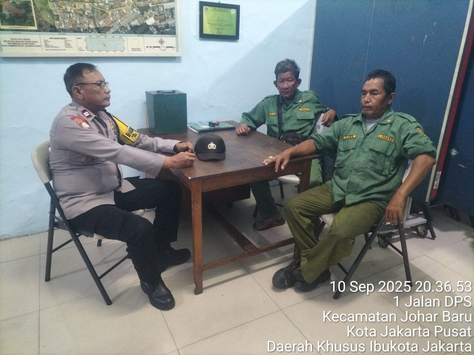 refubliknews.com, || Jakarta Pusat – Dalam rangka menjaga keamanan dan ketertiban masyarakat, Bhabinkamtibmas Kelurahan Johar Baru Aiptu Sunarto melaksanakan patroli dialogis, sambang poskamling, dan cooling system pada Kamis dini hari (11/9/2025) pukul 00.00 WIB di Poskamling RW 06, Jalan Percetakan Negara II, Kelurahan Johar Baru, Jakarta Pusat.