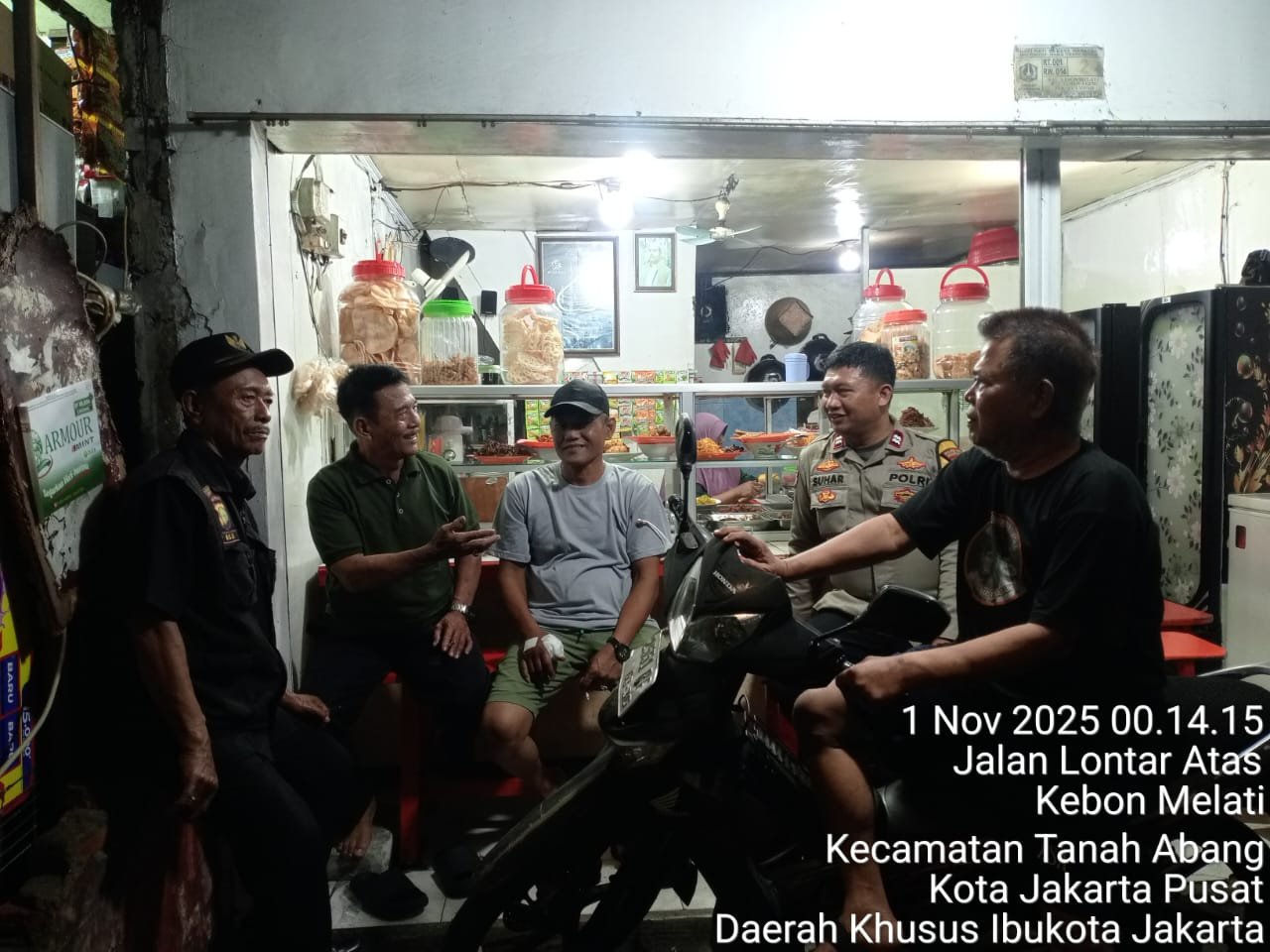 refubliknews.com, || Jakarta Pusat – Bhabinkamtibmas Kelurahan Kebon Kacang Aiptu Suhartono melaksanakan patroli kewilayahan dan sambang ke pos Satkamling RW 09 Jalan Jati Bunder Raya RW 09, Kebon Kacang, Tanah Abang, Jakarta Pusat, pada Sabtu (01/11/2025) sekitar pukul 00.10 WIB.