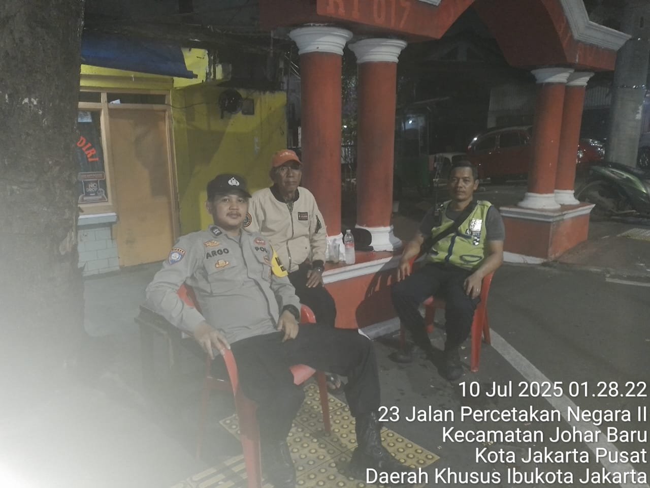 refubliknews.com, || Jakarta Pusat — Dalam rangka memperkuat kemitraan antara polisi dan masyarakat serta menciptakan lingkungan yang aman dan nyaman, Ba Pendamping Binmas Kelurahan Johar Baru Briptu Argo Ryantama Putra melaksanakan kegiatan cooling system dan patroli siskamling di wilayah RW 07 Kelurahan Johar Baru, Kecamatan Johar Baru, Jakarta Pusat, pada Kamis dini hari, 10 Juli 2025 pukul 01.30 WIB.