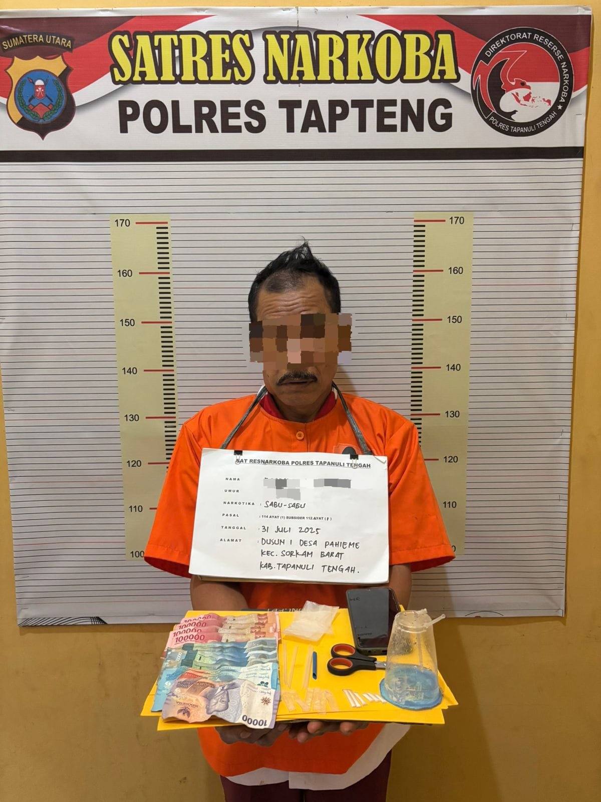 Tersangka diketahui berinisial BST (60 th), warga Dusun I, Desa Pahieme I, Kecamatan Sorkam Barat. Dari tangan tersangka, polisi menyita barang bukti berupa 6 (enam) paket sabu-sabu, 6 (enam) plastic klip kosong, 2 (dua) plastic bening sedang, 4 (empat) pipet yang telah digunting, 1 (satu) sendok sabu dari pipet, uang tunai Rp1.010.000 yang diduga hasil penjualan sabu, 1 (satu) buah bong, 1 (satu) gunting, dan (satu) unit ponsel Andoid.