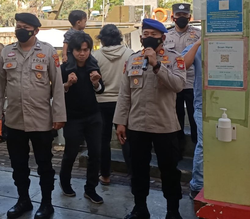 “Bapak-bapak, Ibu-ibu, Saudara Saudari sekalian, kami dari Polres Kepulauan Seribu menyampaikan untuk selalu menerapkan prokes ketat. Dan jangan lupa scan PeduliLindungi serta menunjukkan hasil scan kepada petugas sebelum menaiki kapal,” ujar Budi.