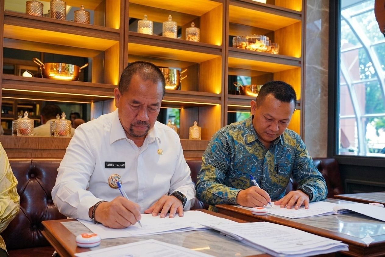 Bupati Batu Bara H. Baharuddin Siagian, S.H., M.Si., menandatangani Naskah Perjanjian Hibah Barang atas pelepasan sebagian lahan Hak Guna Usaha (HGU) serta Berita Acara Serah Terima Hibah antara PT Bakrie Sumatera Plantations Tbk dengan Pemerintah Kabupaten Batu Bara.