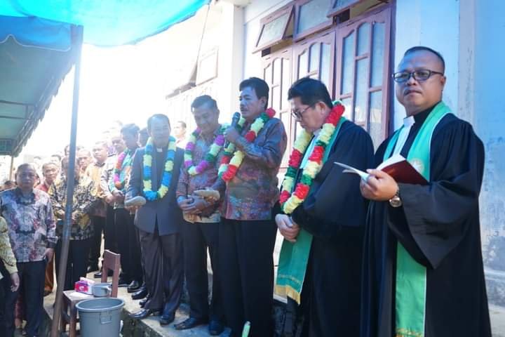 refubliknews.com, – Nias Barat, Bupati Nias Barat Khenoki Waruwu mengikuti ibadah sekaligus menghadiri acara Peletakan Batu Pertama Gedung Gereja BNKP Jemaat Duria Resort 23 yang dilaksanakan di Gedung Gereja BNKP Duria Desa Duria Kecamatan Lolifitu Moi, Minggu (21/1/2024).