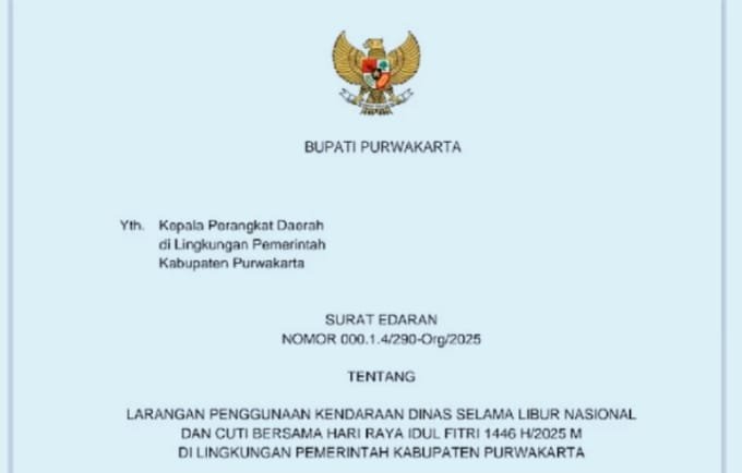 Pernyataan Om Zein di perkuat dengan diterbitkannya Surat Edaran (SE) Nomor 000.1.4/290-Org/2025 tentang Larangan Penggunaan Kendaraan Dinas selama libur nasional dan cuti bersama dalam rangka Hari Raya Idul Fitri 1446 H/2025 M di lingkungan Pemkab Purwakarta, Kamis 27 Maret 2025.