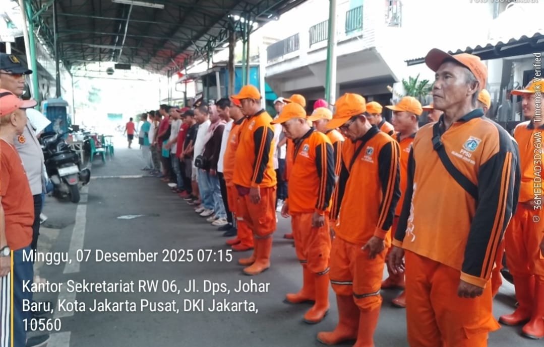 refubliknews.com, || Jakarta Pusat — Dalam upaya mencegah banjir sekaligus menjaga kebersihan lingkungan jelang musim penghujan, Bhabinkamtibmas Kelurahan Johar Baru, Aiptu Sunarto, melaksanakan kegiatan kerja bakti bersama warga di wilayah RW 06, Johar Baru, Jakarta Pusat, pada Minggu (7/12/2025) pukul 07.00 WIB.