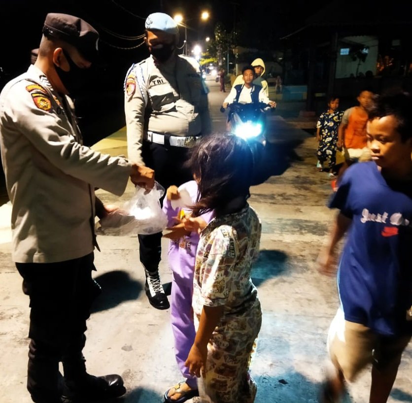 Kegiatan patrol malam juga digelar untuk membagi – bagikan masker kepada masyarakat guna mencegah penyebaran virus Covid